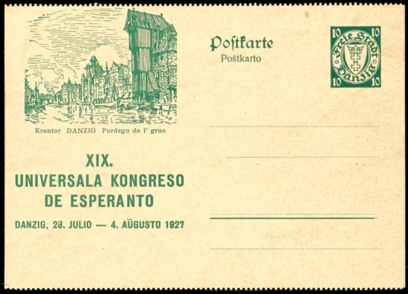 20 penny national coat of arms, Special picture postcard to the 10. ESPERANTO-CONGRESS, picture "Gdansk, winter place with Postal service and telegraphs administration", perforated margin strip separated, rarely offered, Michel 300.- (P40II/015b) (Image 1)(Image)