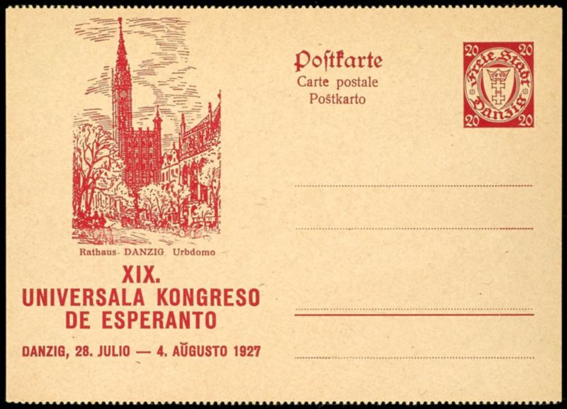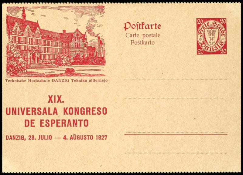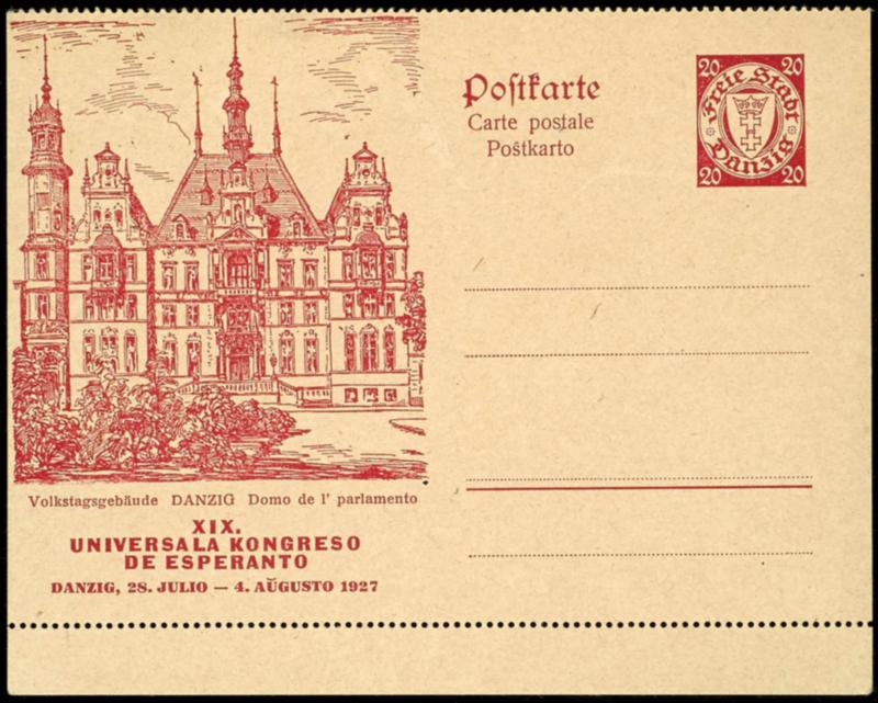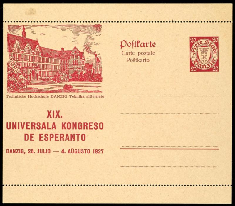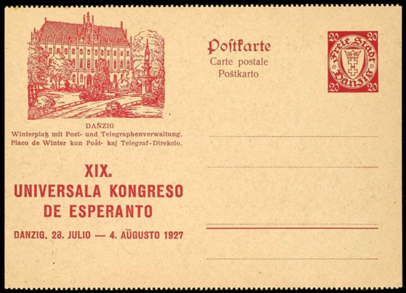 20 Pfennig Staatswappen, Sonderbildpostkarte zum 10. Esperanto-Kongress, Bild "Danzig, Winterplatz mit Post- und Telegraphenverwaltung", gezähnt Randstreifen abgetrennt, selten angeboten, Mi. 300.-