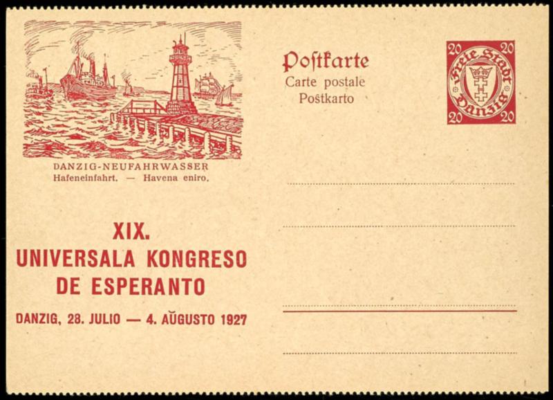 20 penny national coat of arms, Special picture postcard to the 10. ESPERANTO-CONGRESS, picture "Gdansk Neufahrwasser Harbor entrance", perforated margin strip separated, rarely offered, Michel 300.- (P40II/05b) (Image 1)(Image)