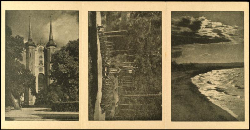 1934, winter help work. : vertical strip of three with the pictures (top down) : #1 moonlight on the beach by Brosen, 2 Sopot: Forest opera Tannhaeuser, and #3 churches portal Cloister church Oliva (postage stamp impression). Unused, good condition. (HP1-1/2/3) (Image 1)(Image)