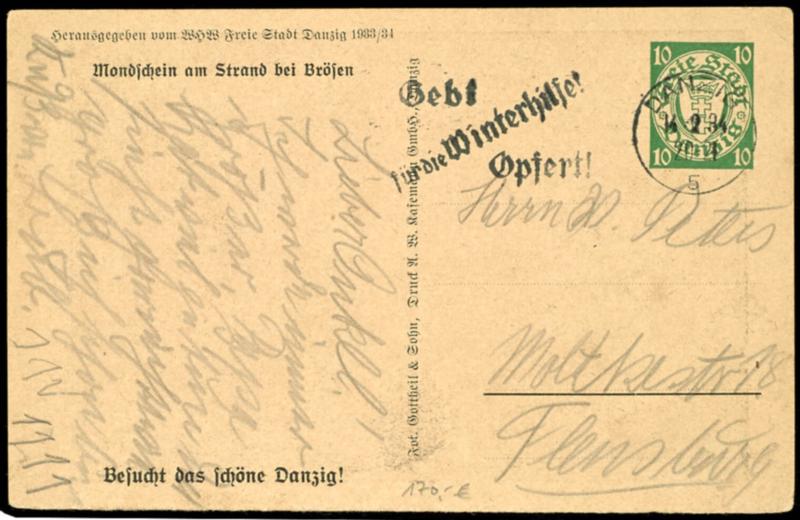 1934, 10 Pfennig Staatswappen Sonderpostkarte für das Winterhilfswerk mit Bild 1 "Mondschein am Strand bei Brößen", bedarfsgebraucht von Danzig 14.2.34 nach Flensburg, Mi. 200.-