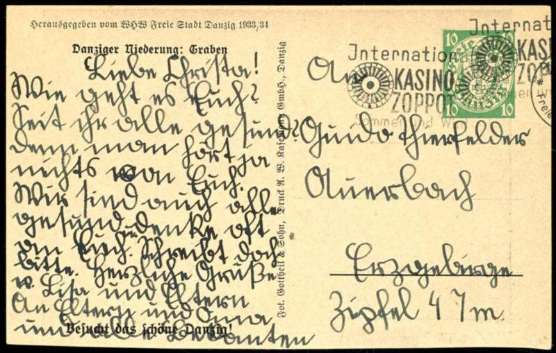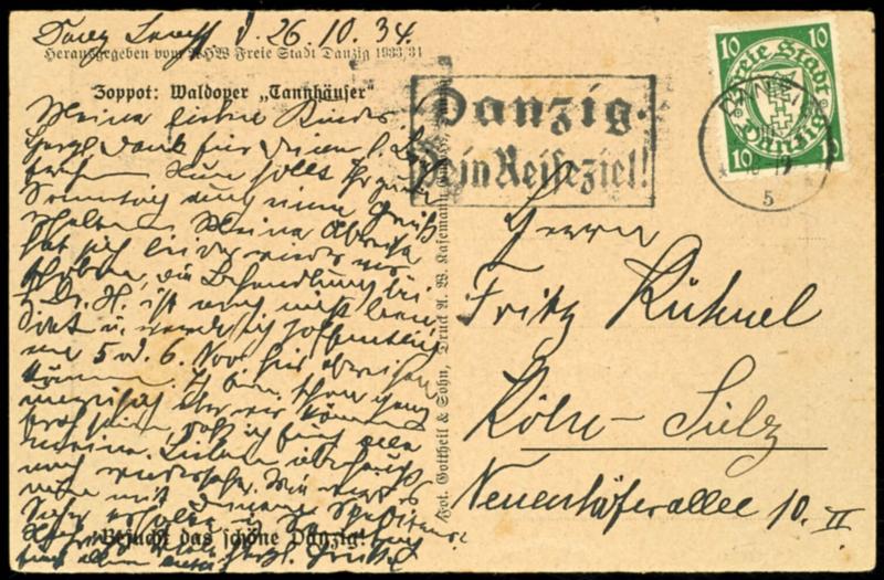 1934, 10 Pfennig Staatswappen Sonderpostkarte für das Winterhilfswerk mit Bild 2 "Zoppot Waldoper Tannhäuser", bedarfsgebraucht von Danzig 26.10.34 nach Köln, Mi. 200.-
