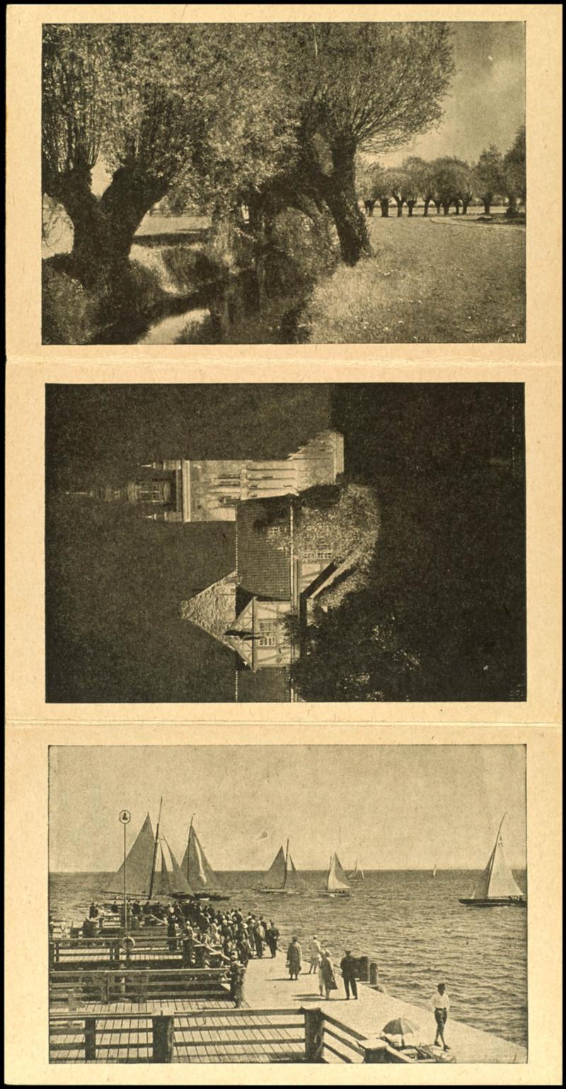 1934, winter help work: vertical strip of three with the pictures (top down) : #5 Danziger LOW-LYING AREA: Dig, 6 Gdansk: St. St. Catherine's Church by night, and #7 Zoppoter sailing regatta (postage stamp impression), unused, good condition, in fact rarely offered! (HP1-5/6/7) (Image 1)(Image)