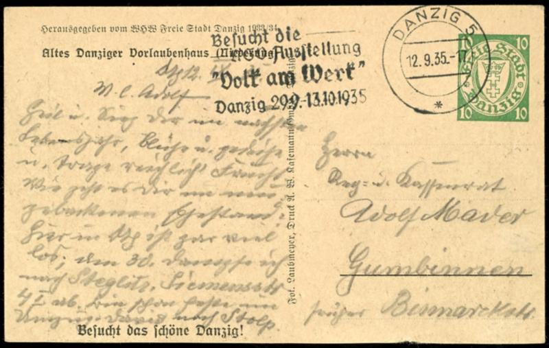 1934, 10 Pfennig Staatswappen Sonderpostkarte für das Winterhilfswerk mit Bild 8 "Alrtes Danziger Vorlaubenhaus", bedarfsgebraucht von Danzig 12.9.35 nach Gumbinnen, Mi. 200.-