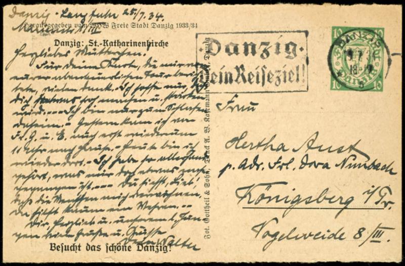 1934, 10 Pfennig Staatswappen Sonderpostkarte für das Winterhilfswerk mit Bild 9 "Danzig: St. Katharinenkirche", bedarfsgebraucht von Danzig 29.7.34 nach Königsberg, Mi. 200.-