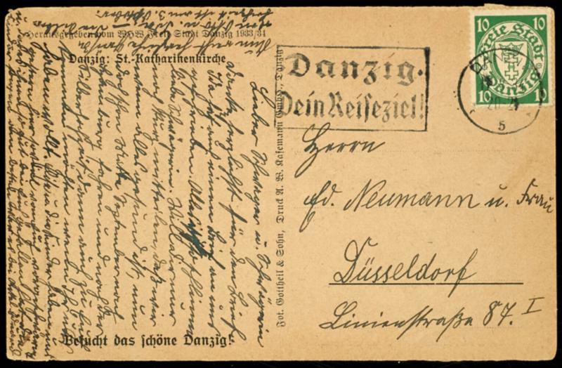 1934, 10 Pfennig Staatswappen Sonderpostkarte für das Winterhilfswerk mit Bild 9 "Danzig: St. Katharinenkirche", ohne Wertstempel, daher mit 10 Pfennig Marke Staatswappen frankiert, bedarfsgebraucht von Danzig 13.8.34 nach Düsseldorf, Mi. 200.-
