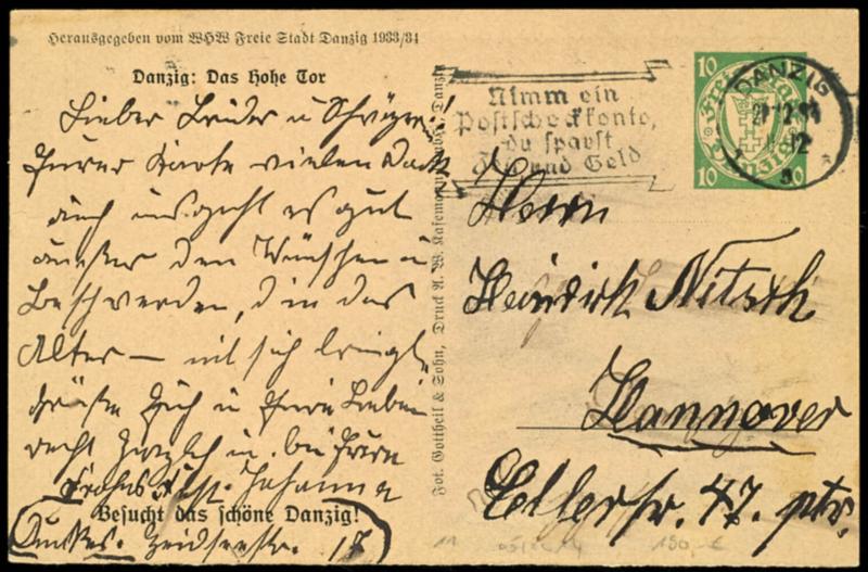 1934, 10 Pfennig Staatswappen Sonderpostkarte für das Winterhilfswerk mit Bild 11 "Das hohe Tor", bedarfsgebraucht von Danzig 20.12.34 nach Hannover, Mi. 200.-