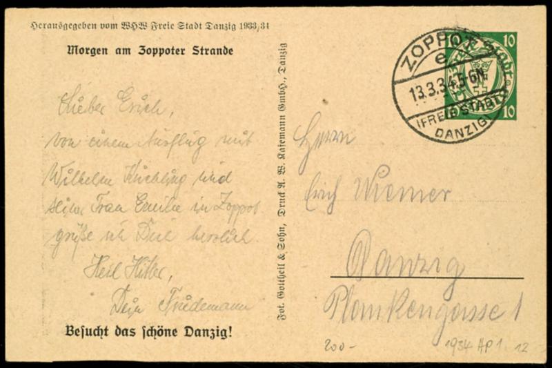 1934, 10 Pfennig Staatswappen Sonderpostkarte für das Winterhilfswerk mit Bild 12 "Morgen am Zoppoter Strande", bedarfsgebraucht von Zoppot 13.3.34 nach Danzig, Mi. 200.-