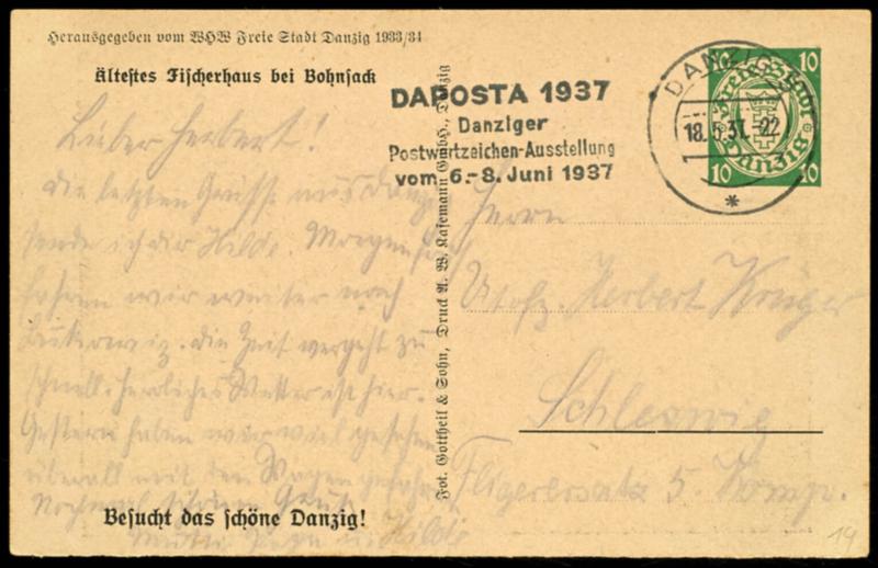 1934, 10 Pfennig Staatswappen Sonderpostkarte für das Winterhilfswerk mit Bild 14 "Ältestes Fischerhaus bei Bohnsack, bedarfsgebraucht von Danzig 18.5.37 nach Schleswig, Mi. 200.-