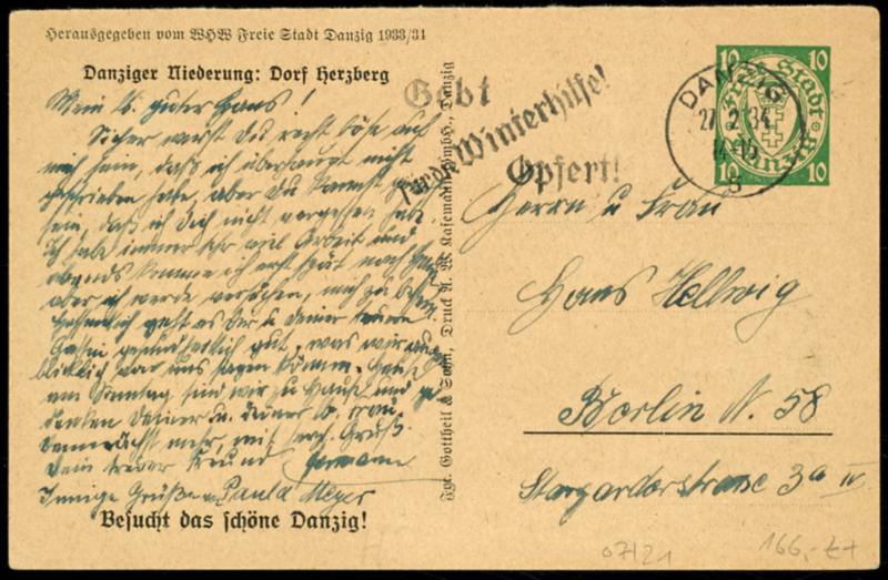 1934, 10 Pfennig Staatswappen Sonderpostkarte für das Winterhilfswerk mit Bild 16 "Danziger Niederung: Dorf Herzberg", bedarfsgebraucht von Danzig 27.2.34 nach Berlin, Mi. 200.-
