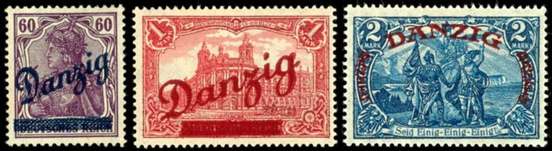 1934, Winterhilfswerk: senkrechter 3er-Streifen mit den Bildern (von oben nach unten): #14 Ältestes Fischerhaus bei Bohnsack, #15 Danzig: St. Marien vom Rathausturm, und #16 Danziger Niederung: Dorf Herzberg (Wertstempel), ungebraucht, gute Erhaltung, recht selten!