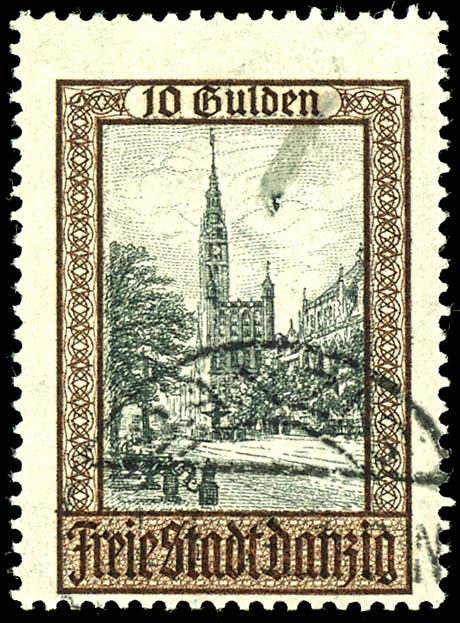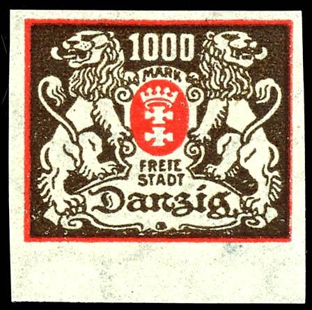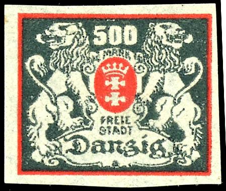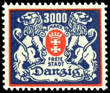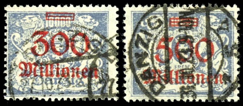 300 Mk with plate flaw "wedge through tail and butt of the left lions", centric cancellation Gdansk 25.7.23, abridged certificate Tworek BPP "perfect" (130V) Certificate 300 Mk mit Plattenfehler "Keil durch Schwanz und Hinterteil des linken Löwen", zentrisch gestempelt DANZIG 25.7.23, Kurzbefund Tworek BPP "einwandfrei" (Image)