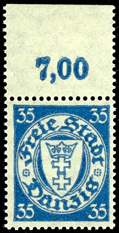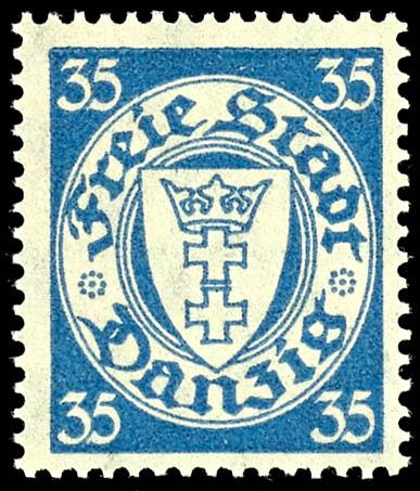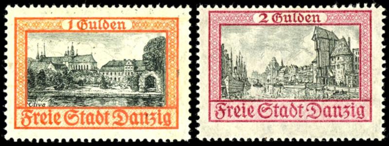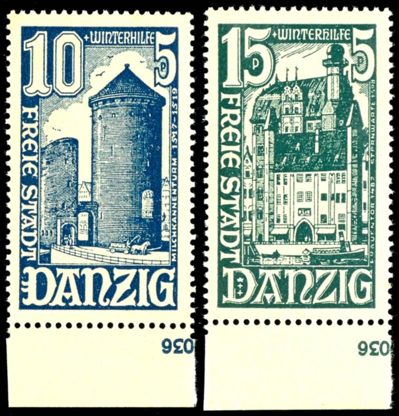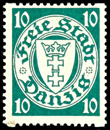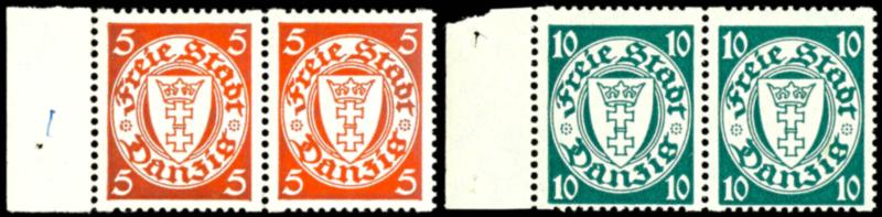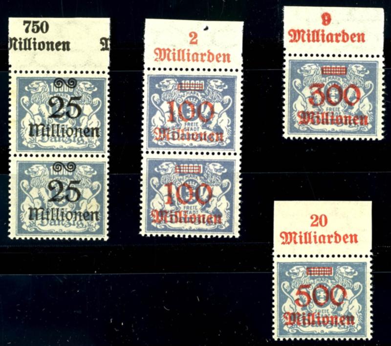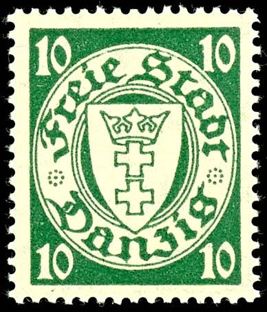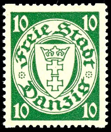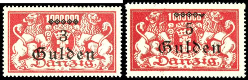 10 penny to 5 Mark with overprint "Gdansk", without 3 Mark, for that 2 and 2, 50 Mark in an and b-colour, mint never hinged, perfect, Michel 120,- (1/12,14,15) 10 Pfennig bis 5 Mark mit Aufdruck "Danzig", ohne 3 Mark, dafür 2 und 2,50 Mark in a und b-Farbe, postfrisch, einwandfrei, Mi. 120,- (Image)