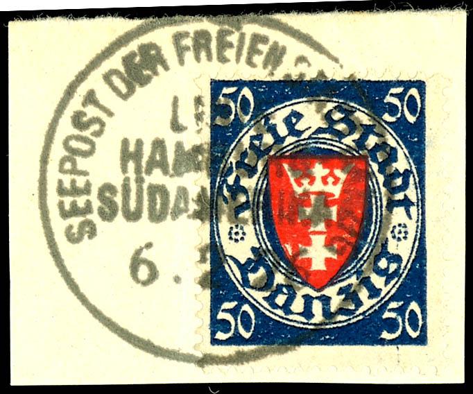 5 to 50 penny, perfectly letter pieces with postmark "sea mail the free city of Danzig line Hamburg -South America", rare! (193/200) 5 bis 50 Pfennig, einwandfreie Briefstücke mit Stempel "SEEPOST DER FREIEN STADT DANZIG LINIE HAMBURG -SÜDAMERIKA", selten! (Image)