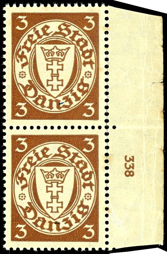 3 penny vertical pair from right margin with HAN 338, mint never hinged, perfect, Michel 60,- (216yHAN) 3 Pfennig senkrechtes Paar vom rechten Rand mit HAN 338, postfrisch, einwandfrei, Mi. 60,- (Image)