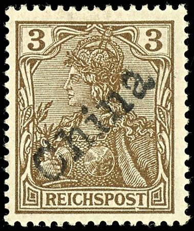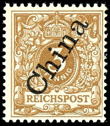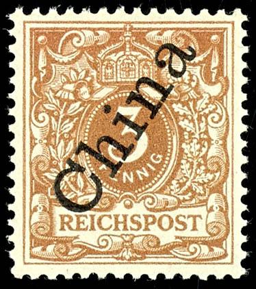 3 pfennigs crown / eagle, pale ochre-brown with steep typography overprint "China", mint never hinged, very fine, expertized Jaeschke Lantelme BPP, Michel 60.- (1IIb)