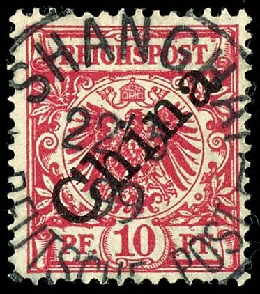 10 pfennigs crown / eagle with diagonal typography overprint "China", red carmine (UV dark red luminous), cancelled by single circle postmark "SHANGHAI 22 / 5 99", very fine, photo expertize Michael Jaeschke Lantelme BPP "in faultless, used condition. ", Michel 700.- (3Ib) Certificate