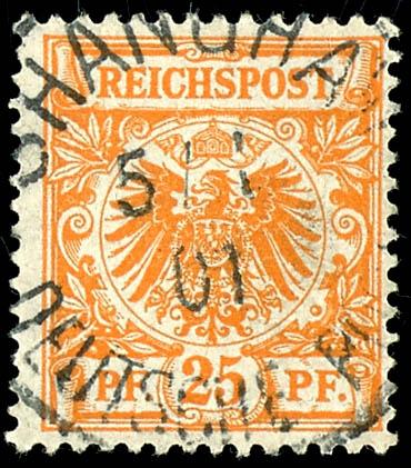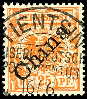 25 pfennigs crown / eagle, dark orange with diagonal typography overprint "China", cancelled "TIENTSIN 16 / 6", very fine, expertized Jaeschke L. BPP (signed twice), Michel 130.- (5Ib)