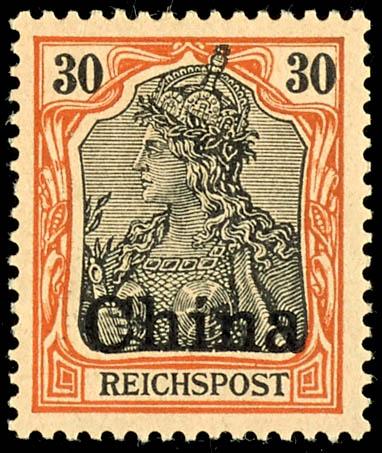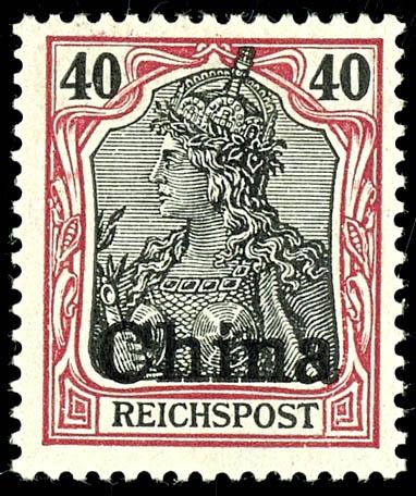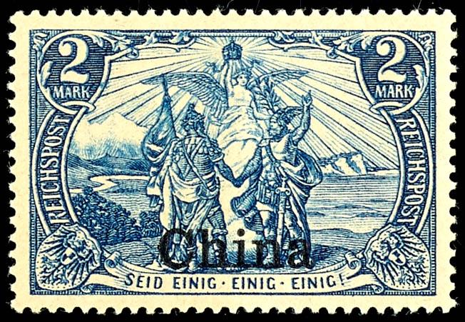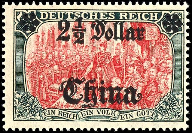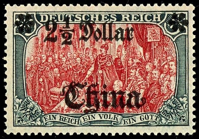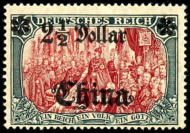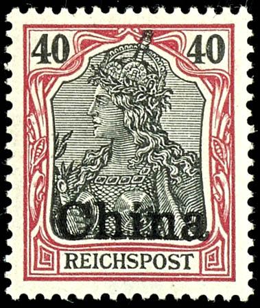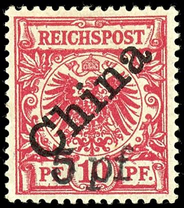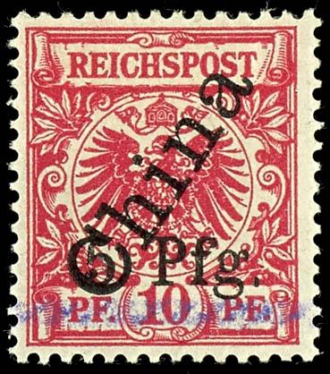 5 pf auf 10 Pfennig Krone/Adler lebhaftlilarot mit diagonalem Bdr.-Aufdruck "China", ungebraucht mit Originalgummierung, tadellose Erhaltung, Fotoattest Michael Jäschke-Lantelme BPP (2025) "in fehlerfreier, gebrauchter Erhaltung.", Mi. 800.- (Image 1)(Image)