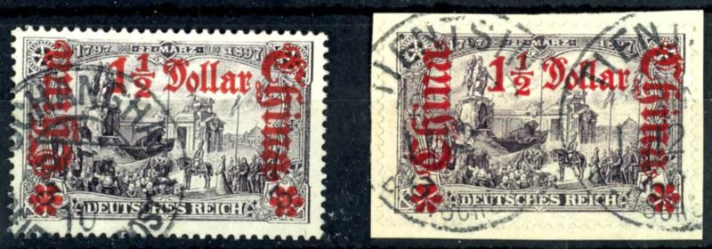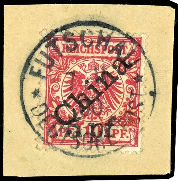 5 pf on 10 pfennigs crown / eagle bright-purple-red with diagonal typography overprint "China", cancelled by single circle postmark "FUTSCHAU 7 / 11 00" on piece, very fine, photo expertize Michael Jaeschke Lantelme BPP (2025) "in faultless, used condition. ", Michel 1-200.- (7IB) Certificate