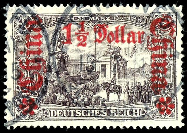 1 1/2 Dollar on 3 Mark, peace printing, 26 : 17 perforation holes, blackish violet (red orange luminous), used, very fine, Michel 150.- (46IAa)