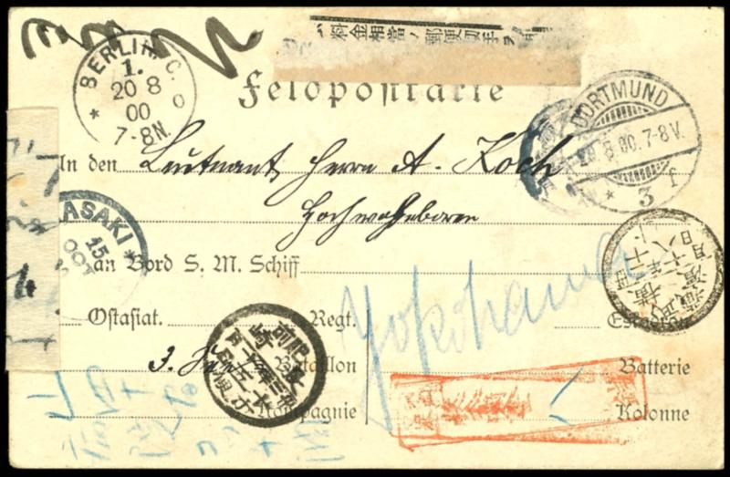 1900, fieldpost printed form card from the homeland, mailed in "Dortmund 20.8.00", transported via Naval Post Office with rare on route passing cancellation "BERLIN C 1 20 8 00", addressed last of all to Yokohama with various postmarks and adhesive labels respectively remainders such, very interesting card in neat legitimate condition.