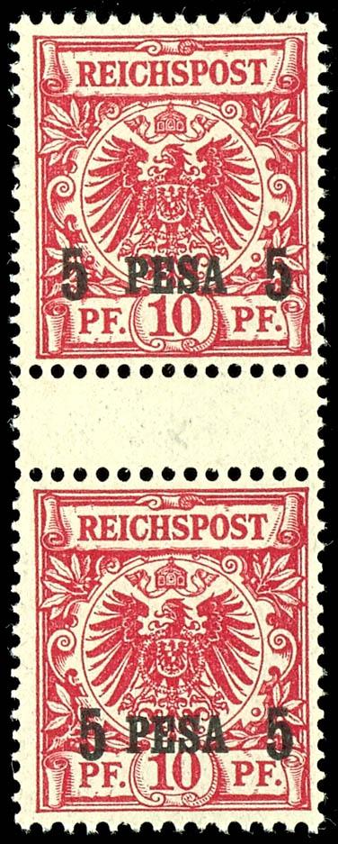 5 Pesa auf 10 Pfennig Krone/Adler lebhaftlilarot (UV karmin), Aufdruck 15,4 mm (Feld 48) und 14,4 mm (Feld 58), senkrechtes Zwischenstegpaar mit der extrem seltenen Aufdrucktype II, postfrisch, tadellose Erhaltung, unsigniert, Fotoattest Ronald F. Steuer VÖB "qualitativ vollkommen einwandfrei.", Mi. -.- - uns ist kein weiteres Zwischenstegpaar in dieser Kombination bekannt. (Image 1)(Image)