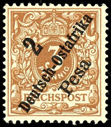 2 Pesa on 3 pfennigs crown / eagle mid-brown, adhesive gutter and margin of sheet (there rest of hinge), stamp mint never hinged, very fine, unsigned, photo expertize Michael Jaeschke Lantelme BPP (2025) "in faultless, mint never hinged condition. ", Michel 250.- (6a) Certificate