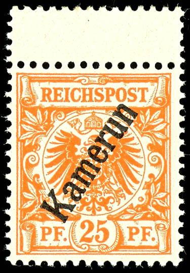 25 pfennigs crown / eagle dark orange with black typography overprint "Cameroon", above adhesive gutter, mint never hinged, very fine, unsigned, photo expertize Ronald F. Steuer BPP "genuine and immaculate", Michel 168.- (5b) Certificate