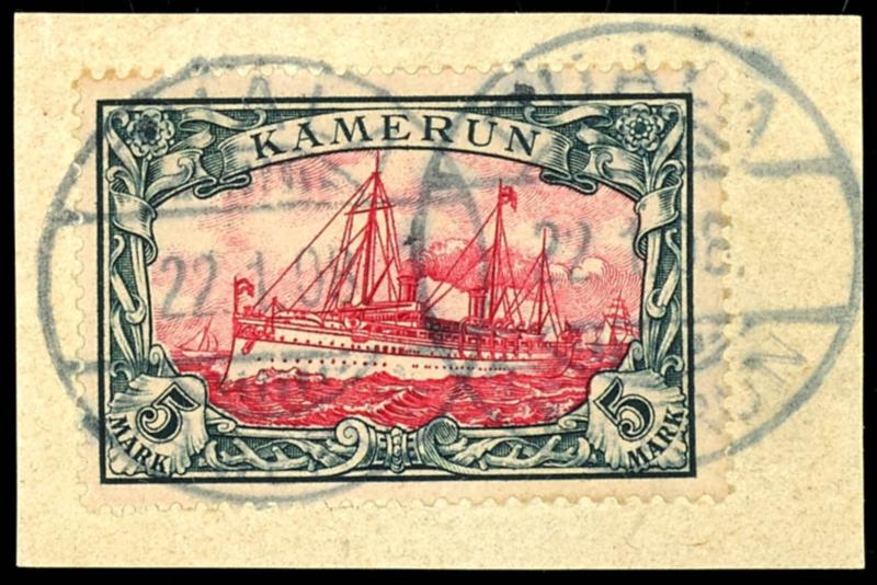 5 Mark imperial yacht on paper without watermark, cancelled "LONGJI Cameroon * * 19.4.11", very fine, expertized R. Steuer BPP, Michel 600.- (19)