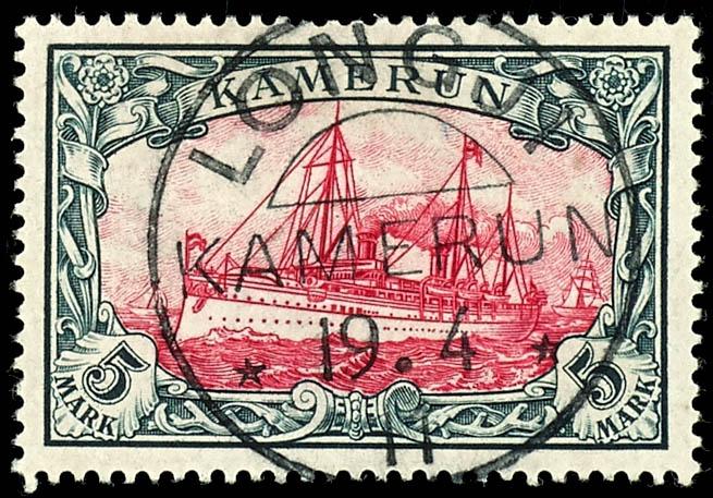 5 Mark Kaiseryacht auf Papier ohne Wasserzeichen, entwertet "LONGJI KAMERUN * * 19.4.11", tadellose Erhaltung, geprüft R. Steuer BPP, Mi. 600.- (Image 1)(Image)