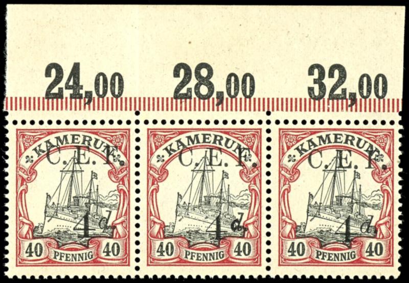 40 pfennigs imperial yacht with overprint" C. E. F. 4 d. ", horizontal strip of three from upper margin, slightly tropicalised. Margin a little creasely. (7)