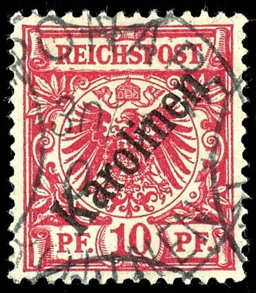 10 pfennigs crown / eagle with diagonal overprint Caroline, neat cancelled Ponape 30 / 1 / 01, expertized Dr. Lantelme BPP, Michel 160.- (3I)