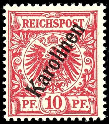 10 Pfennig Krone/Adler mit steilem Bdr.-Aufdruck "Karolinen", lilarot, UV hellzinnober, postfrisch, tadellose Erhaltung, unsigniert, Fotoattest Ronald F. Steuer BPP "in einwandfrei postfrischer Erhaltung", Mi. 500.- (Image 1)(Image)
