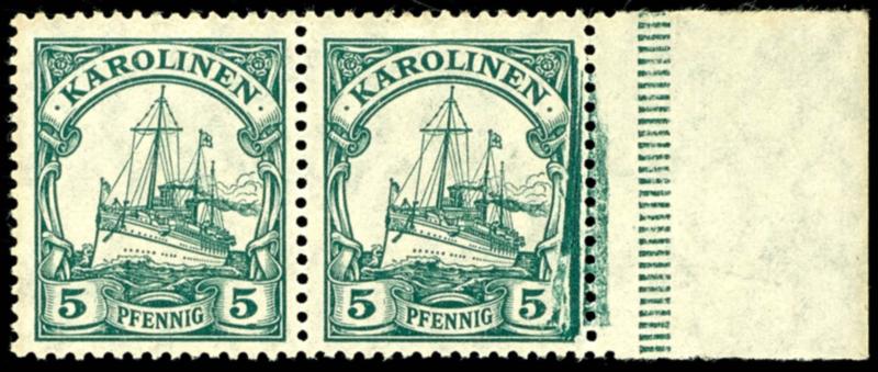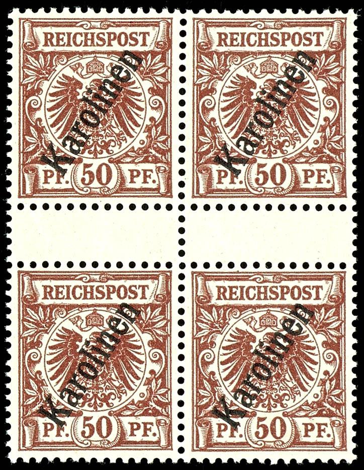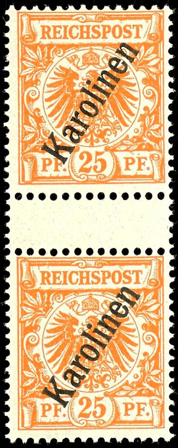 50 Pfennig Krone/Adler lebhaftrötlichbraun mit schwarzem, steilem Bdr.-Aufdruck "Karolinen", senkrechtes Zwischenstegpaar, zwei Stück als Einheit, postfrisch, tadellose Erhaltung, unsigniert, Fotoattest Michael Jäschke-Lantelme BPP "in fehlerfreier, postfrischer Erhaltung.", Mi. 1.100.- (Image 1)(Image)