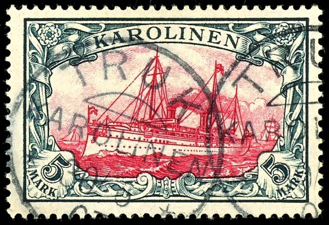 5 Mark Kaiseryacht auf Papier ohne Wasserzeichen, grünschwarz/dunkelkarmin, entwertet "TRUK (KAROLINEN) 20 5", tadellose Erhaltung, geprüft Richter, Pfenninger (Image 1)(Image)