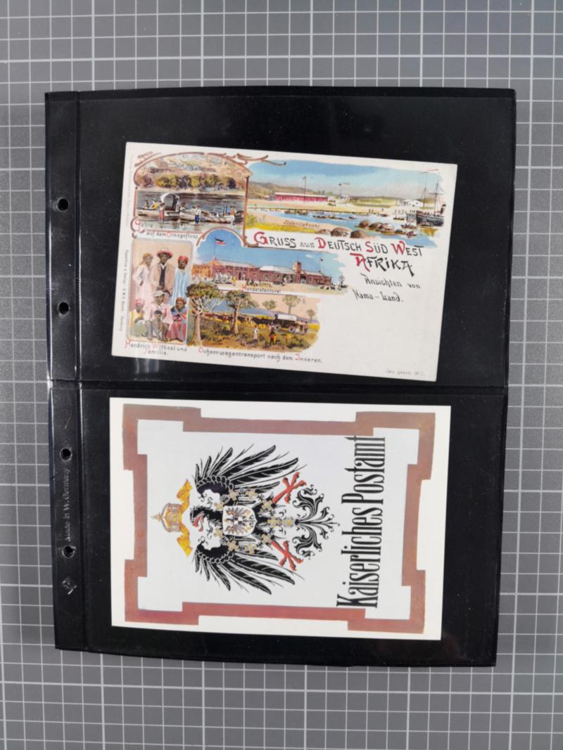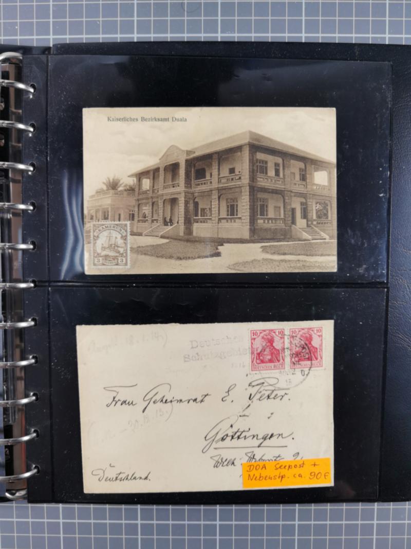 1900/20(ca.), Briefalbum mit 50 Briefe, Karten, GZ und Ansichtskarten sowie 5 x MSP, 2 x Seepost (10 St. ungelaufen) mit etlichen besseren Belegen, u a. AK DNG mit MSP- Nr. 60, AK Türkei mit 2x Nr. 12 II, DSWA Jahrhundert-GZ Swakomund", GZ TOGO AVHEGAM, E-Brief Türkei usw., meist gute Erhaltung