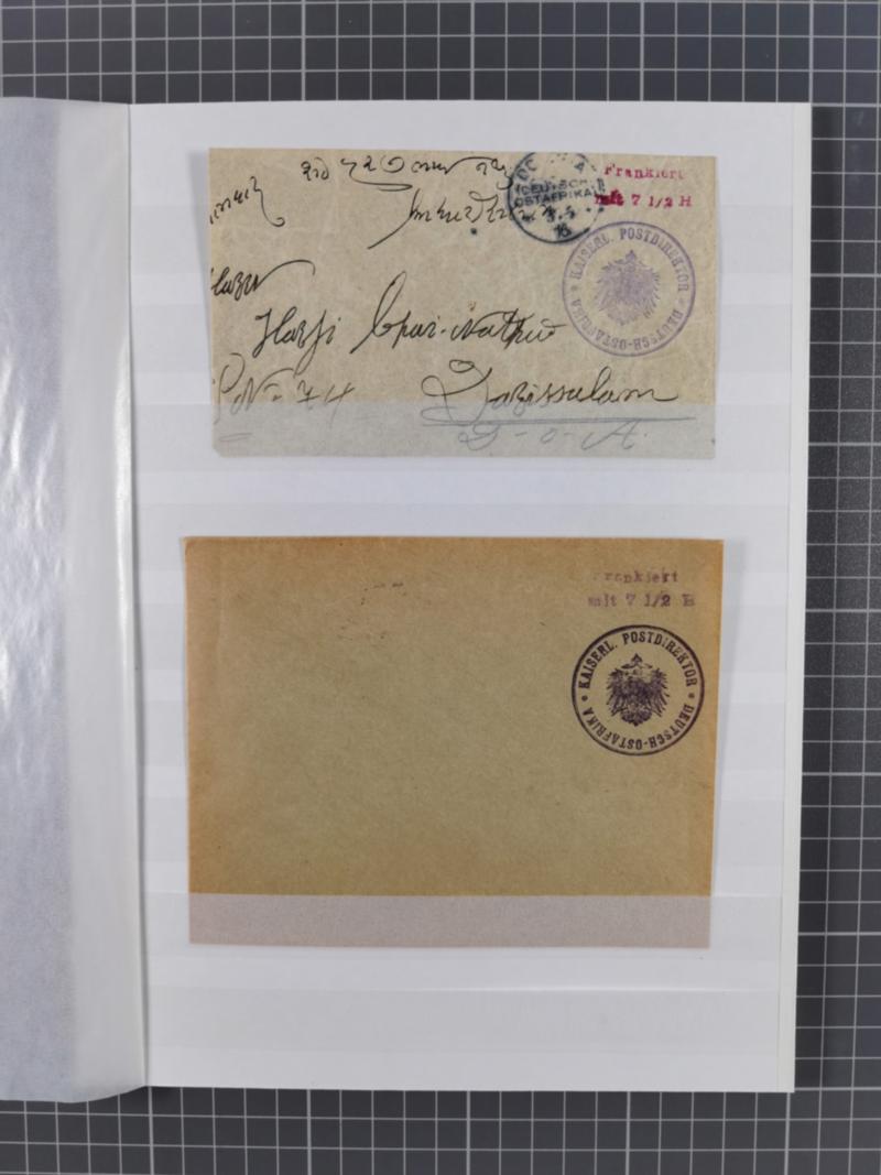 1915/1916, Notmaßnahmen, Partie von sieben Briefen, dabei vier ungebrauchte Umschläge, Eingeborenenbrief (etwas verkürzt) von Dodoma 3.6.16 nach Daressalam 7.6.16, weiterhin neun Ausschnitte mit Barfrankierungsvermerken.