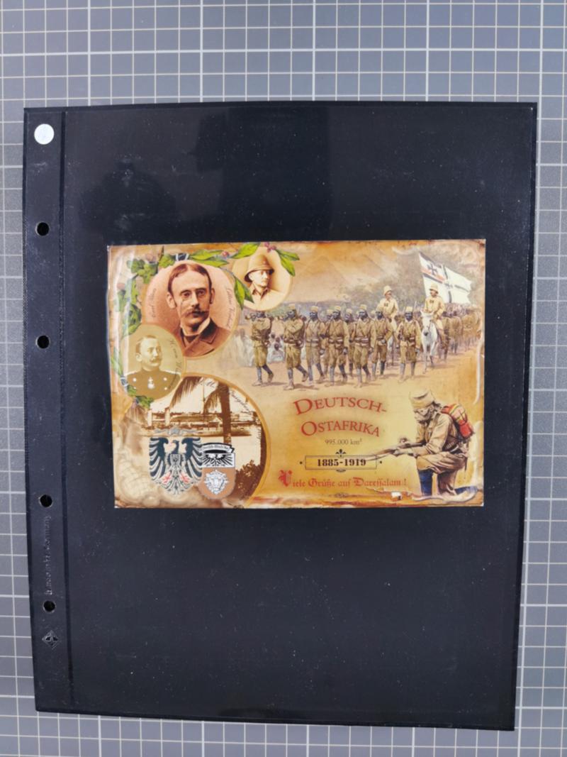 1914/1916, "Kriegsnachrichten”, Sammlung von 172 Drucksachenkarten ab Tanga mit Berichten zu den aktuellen Kriegsereignissen, fast alle adressiert an Dr.K.Braun in Amani. Die Karten sind fortlaufend nummeriert von "27/28/29” vom 30.8.14 bis "582” vom 5.5.16; die ersten 100 Karten vom 30.8.14 bis 24.5.15 sind frankiert mit 2½ H. Schiffszeichnung, die anderen Karten vom 26.5.15 bis 5.5.16 zeigen Barfrankierungsvermerke. Vereinzelt mit Beförderungs-/Archivierungsspuren, überwiegend sauber erhalten.