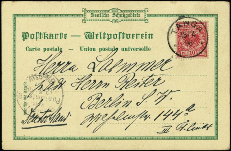 1890, Krone/Adler 10 Pfg. lebhaftlilarot mit klarem Stempel "TANGA ** 18.4.98” auf farbiger Ansichtskarte mit Grußtext nach Berlin mit Ankunftsstempel, in einwandfreier Erhaltung, sign. Jäschke-L. BPP
