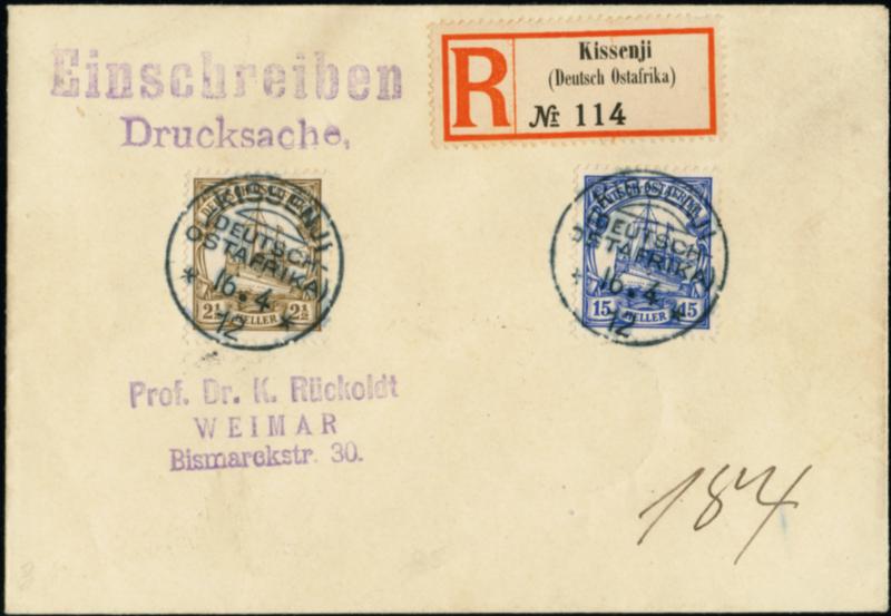 "KISSENJI DOA 16.4.12” zweimal klar auf Kaiseryacht 2½ und 15 H. mit Wasserzeichen als tarifgerechte Frankatur auf R-Drucksachen-Umschlag mit R-Zettel "Kissenji (Deutsch-Ostafrika)” (Einfeldt Nr. 1) nach Weimar mit Ankunftsstempel, in einwandfreier Erhaltung. Bisher sind nur wenige R-Briefe aus Kissenji bekannt
