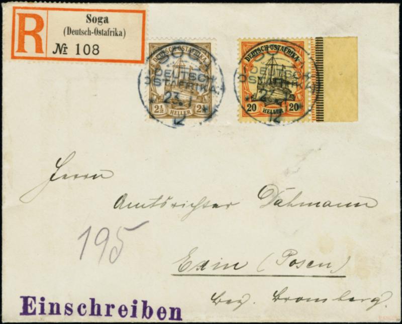 "SOGA DOA 12.1.12” zweimal klar auf Kaiseryacht 2½ und 20 H. mit Wasserzeichen als tarifgerechte Frankatur auf R-Brief mit R-Zettel "Soga (Deutsch-Ostafrika)” (Einfeldt Nr. 1) nach Exin mit Ankunftsstempel, leichte Beförderungsspuren, in guter Erhaltung. R-Briefe aus Soga sind sehr selten, sign. Wenger und Mansfeld