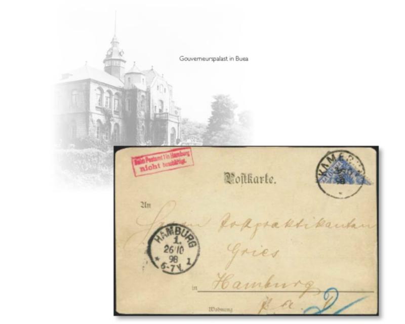 1897/99, 20 Pfg. diagonal halbiert, linke Hälfte, sauber mit EKr. "KAMERUN 26/10 98” auf Ansichtskarte "Gruß aus Kamerun” an einen Postpraktikanten nach Hamburg mit vorderseitigem Ankunftsstempel sowie Hinweis-Stempel "Beim Postamt 1 in Hamburg nicht beschäftigt”, die Karte winzig gekürzt, unten kleiner Einriss stabilisiert, sonst tadellos in sehr schöner und attraktiver Erhaltung, sign. und Fotoattest Bothe BPP (1984)
