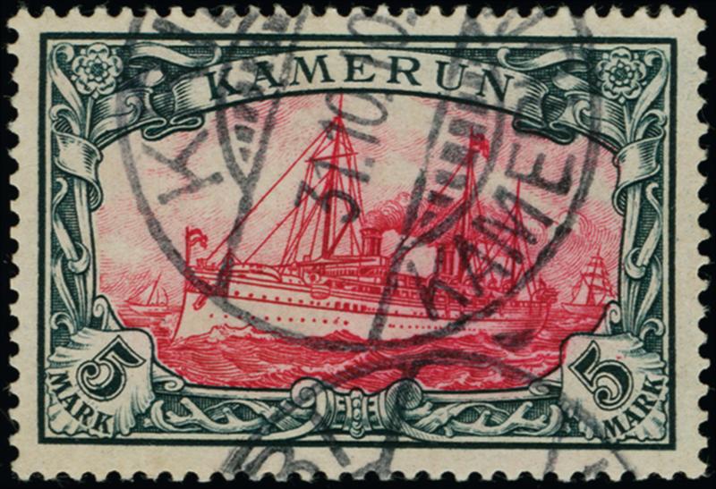 "ABONG-MBANG (KAMERUN) 29.10.12” mehrfach recht klar auf Kaiseryacht 3 Pfg. ohne Wasserzeichen und zwei Einzelmarken 5 Pfg. und Einzelmarke 10 Pfg. mit Wasserzeichen als tarifgerechte Frankatur auf R-Drucksachen-Umschlag mit R-Zettel "Abong-Mbang (Kamerun)" (Einfeldt Nr. 1) nach Löderburg mit Ankunftstempel, in guter Erhaltung, sign. Bothe BPP