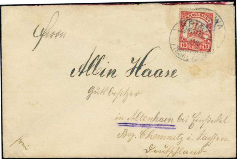 1906, Kaiseryacht 10 Pfg. mit Wasserzeichen, mit Stempel "KRIIBI 13.12.10.” als Nachfrankatur auf Brief mit Poststempel "EBOLOWA KAMERUN 9.12.10” mit Barfreimachungs-Vermerk "10” nach Deutschland. Der Umschlag mit rückseitig Absendervermerk eines Soldaten in Ebololowa hat Altersspuren und die Marke wurde zum Teil gelöst. Eine sehr ungewöhnliche Verwendung, doppelt sign. Eibenstein BPP mit Anschreiben