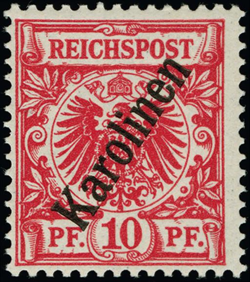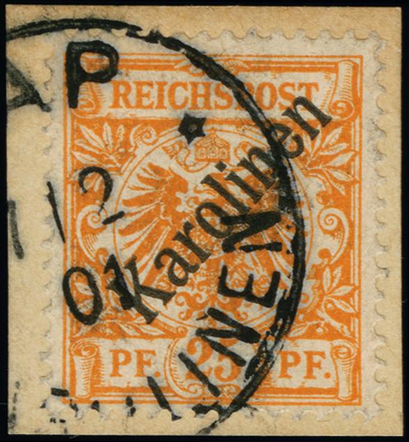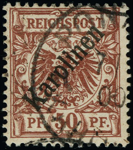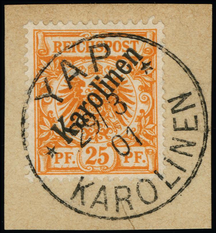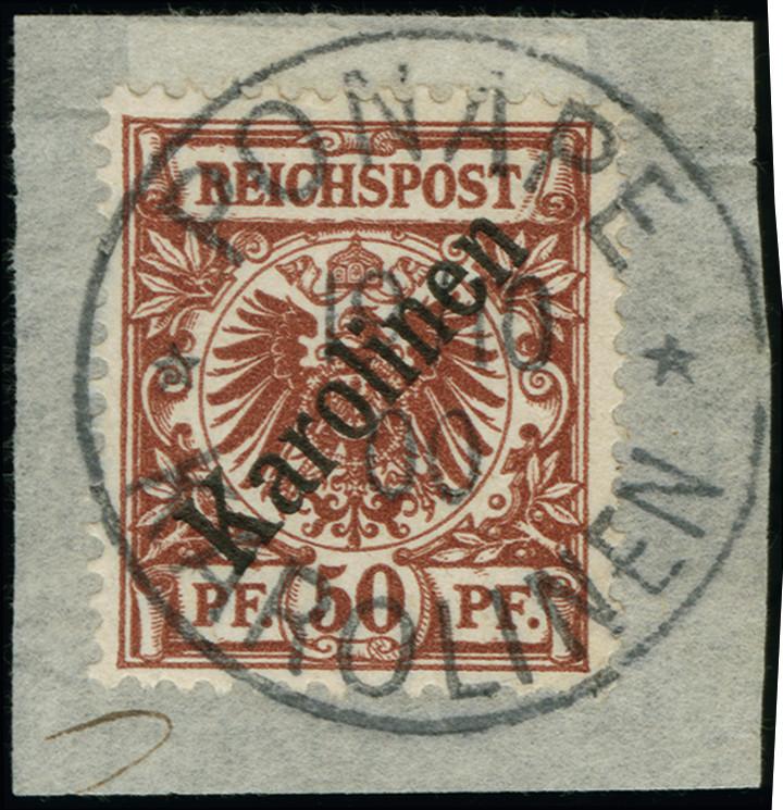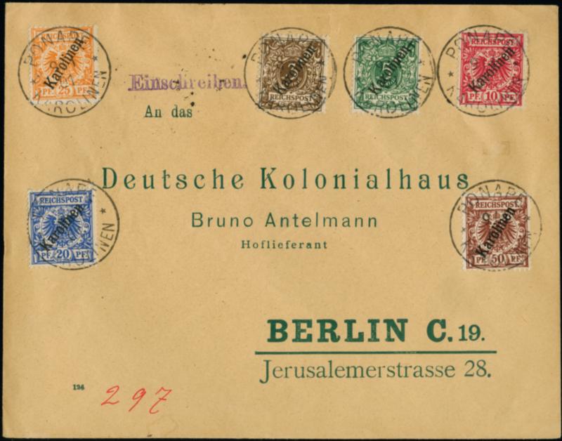 "PONAPE KAROLINIEN ** 9.1.01” mehrfach klar auf Diagonalaufdruck 10 und 20 Pfg. sowie Steilaufdruck 3 Pfg., 5 Pfg. 25 Pfg. und 50 Pfg. auf überfrankiertem R-Vordruckbrief mit handschriftlichem R-Vermerk "297” in Rot (Einfeldt Nr. 2) nach Berlin mit Ankunftsstempel, in einwandfreier Erhaltung, sign. Dr. Steuer VÖB