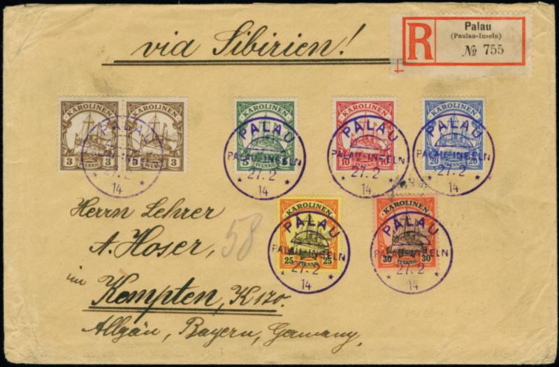 "PALAU PALAU-INSELN 27.2.14” mehrfach klar in Violett auf waagerechtem Paar Kaiseryacht 3 Pfg. und Einzelmarken 5-30 Pfg. auf überfrankiertem R-Brief mit R-Zettel "Palau (Palau-Inseln)" (Einfeldt Nr. 1) via Augsburg nach Kempten mit Ankunftstempel,. Der Umschlag mit Beförderungsspuren im Rand, sonst in guter Erhaltung, ein dekorativer und mit dieser Entwertung nicht häufiger R-Brief