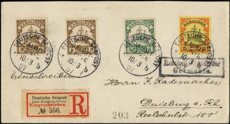 "DSP JALUIT-LINIE b 10.3.07” mehrfach klar auf zwei Einzelmarken Kaiseryacht 3 Pfg. sowie Einzelmarken 5 und 25 Pfg. ohne Wasserzeichen auf überfrankiertem R-Brief mit R-Zettel "Deutsche Seepost Linie Hongkong-Sydney" (Einfeldt Nr. 1) und Rahmenstempel "Reichspostdampfer Germania” unterhalb der Frankatur nach Duisburg mit Ankunftstempel, leichte Patina, in einwandfreier Erhaltung