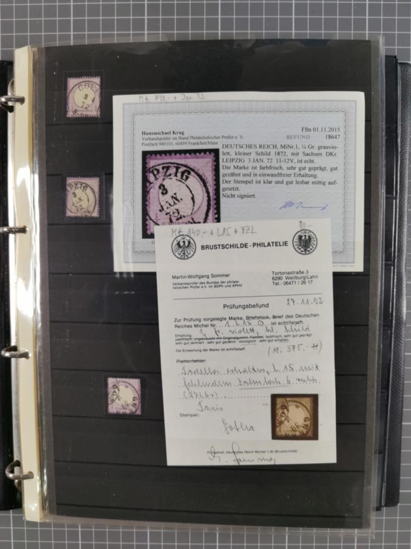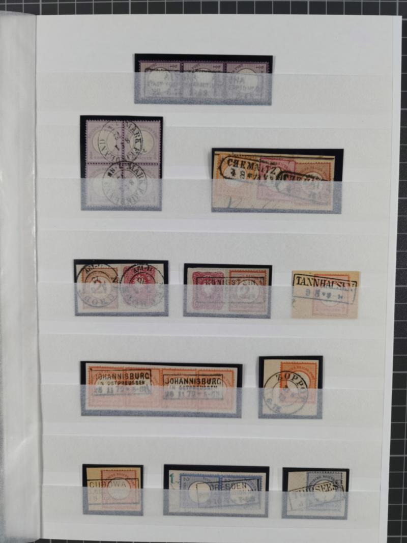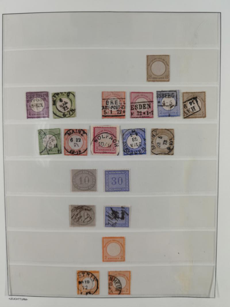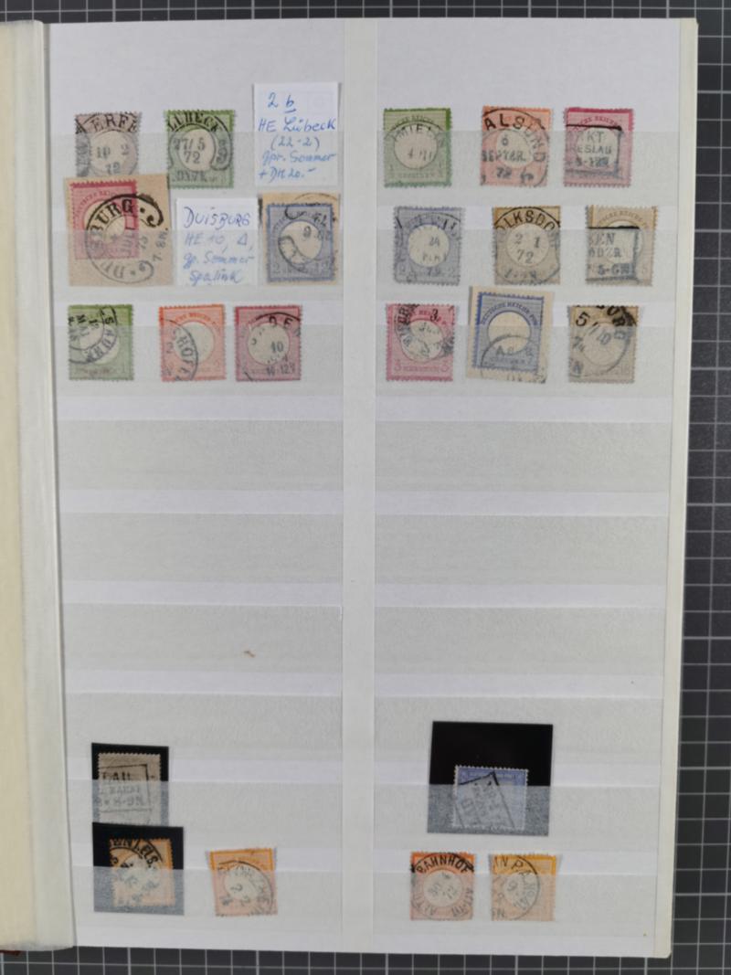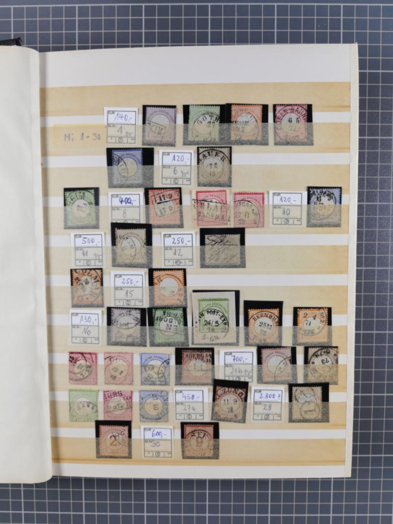 1872/75, gestempelte reichhaltige Sammlung mit etwa 180 Marken/Briefstücken und ca. 40 Briefen, dabei Plattenfehler, seltene Stempel, Einheiten, Erst- und Letzttagsstempel, Mi. 1 auf Ortsbrief, 6 auf Postvorschuss-Paketbegleitbrief, 8 auf Drucksache nach Italien, etc. 13 Atteste und 88 Befunde/Kurzbefunde,