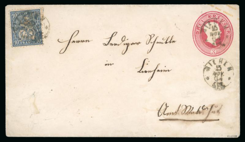 1862-63 Baden 3 Kreuzer red postal stationery envelope, small format with additional franking of Switzerland Sitting Helvetia 10 Rp. blue, both the stamp and the Baden stationery with Swiss cds "RIEHEN 15 NOV 64" (Canton of Basel-Stadt), sent to Lienheim, Amt Waldshut in Baden, without any additional postal fee charged. According to the postal rates of 1855, this cover to Waldshut/Baden would have cost 20 Rappen (= 6 kr.). In this case, the mixed franking was fully accepted (10 Rp. = 3 Kr. Swiss share and 3 Kreuzer German share). A unique Baden-Switzerland mixed franking. Signed Seeger BPP and certificate Brettl BPP "Very rare two-country franking". (Image)